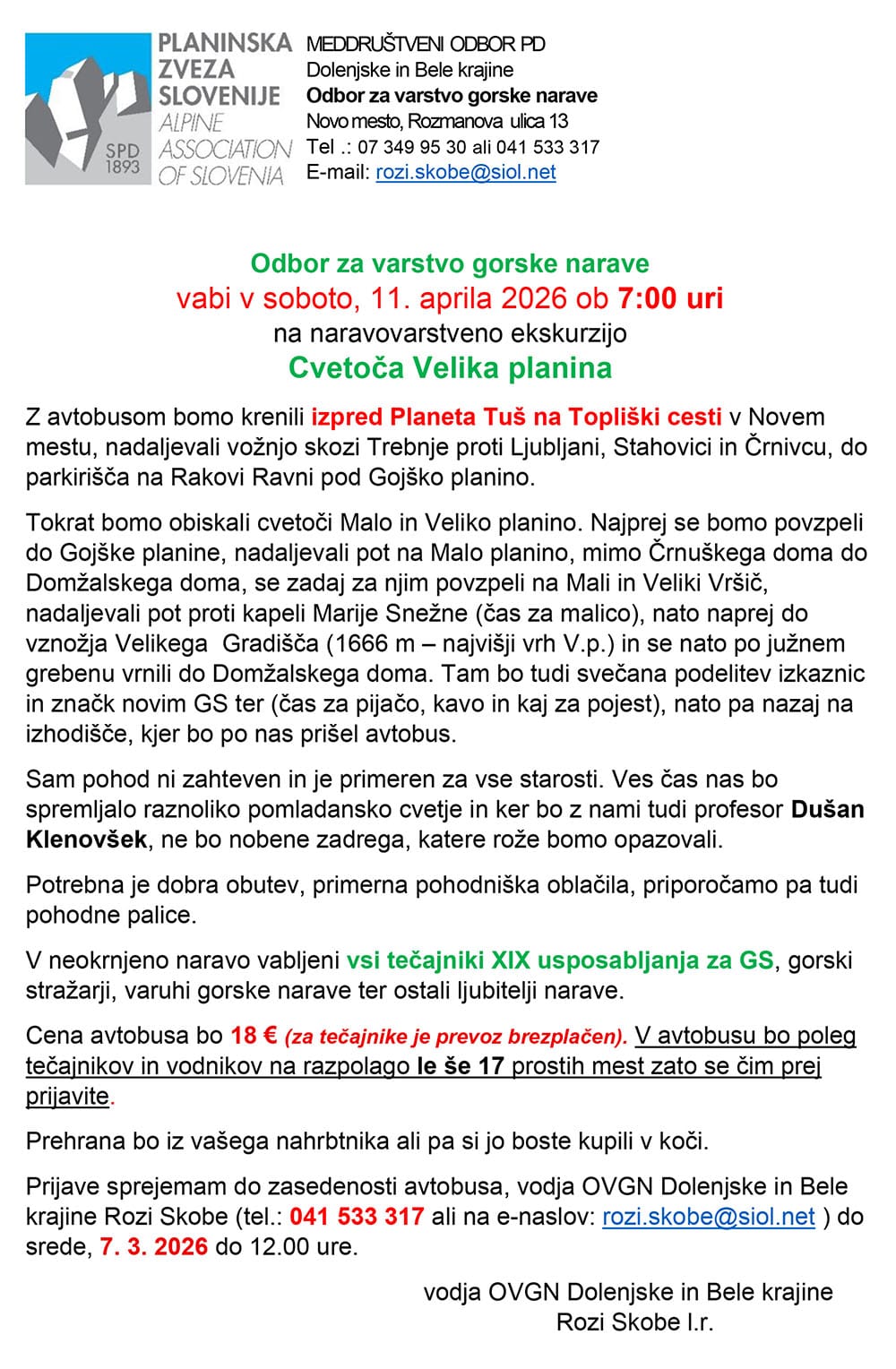 Planinsko društvo Kočevje obvešča vse zainteresirane člane, posebej GS, da se bomo na naravovarstveno ekskurzijo na CVETOČO VELIKO PLANINO, ki jo organizira MDO PD Dolenjske in Bele krajine, odpravili v soboto, 11. 4. 2026. Planinci MDO, bodo startali iz Novega mesta ob 7.00, mi pa iz Kočevja in se bomo z njimi dobili na parkirišču na Rakovi Ravni pod Gojško planino.